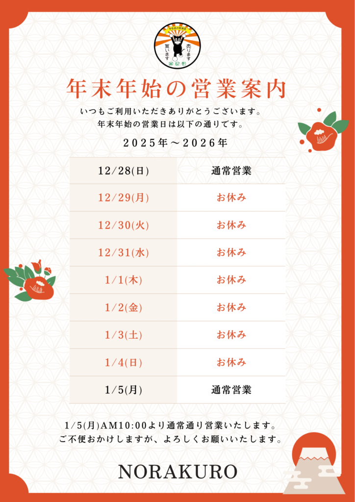 年末年始の営業日のお知らせ Category BLOG, NEWS Date 24 Dec 2025 いつも当店をご利用いただきありがとうございます。年末年始の営業日のお知らせです。 年内は12月28日(日)まで 年始は1月5日(月)から通常営業となります。 休業中は問合せフォームからの返信も行なっておりませんので、お客様にはご迷惑をおかけいたしますがよろしくお願いいたします。 残り数日となりますが、28日まではスタッフ一同皆様のご来店お待ちしております。