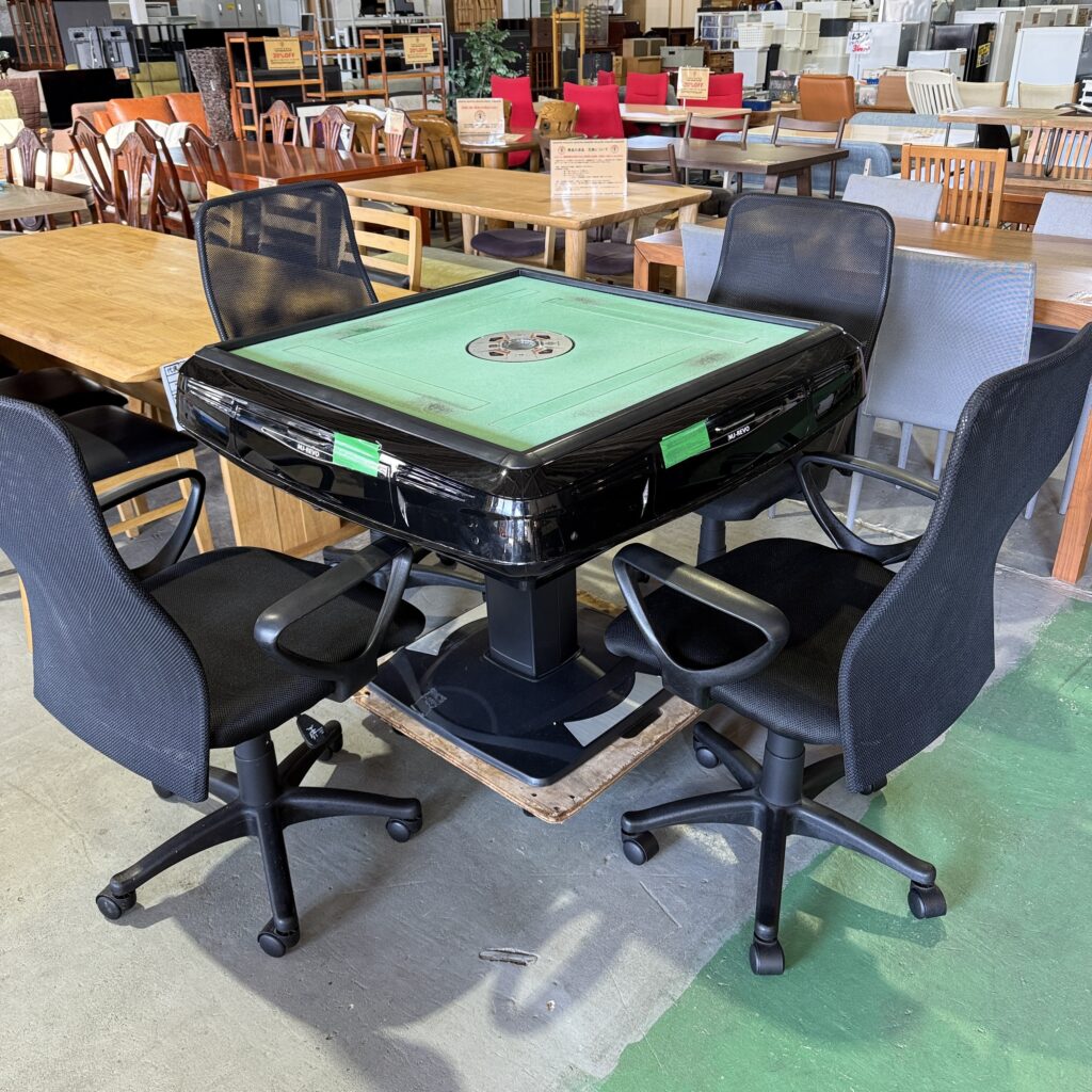 全自動麻雀卓が入荷 Category BLOG, 商品紹介 Date 09 Jan 2026 全自動の麻雀卓が入荷しました! 何気にお問合せを頂くこともしばしばのこちら。。。 テーブルと椅子のセット売りとなります 麻雀牌や点棒などの付属品も全てセットとなっていますのですぐにお楽しみいただけます! 気になる方はぜひ店頭にてご覧くださいませ。
